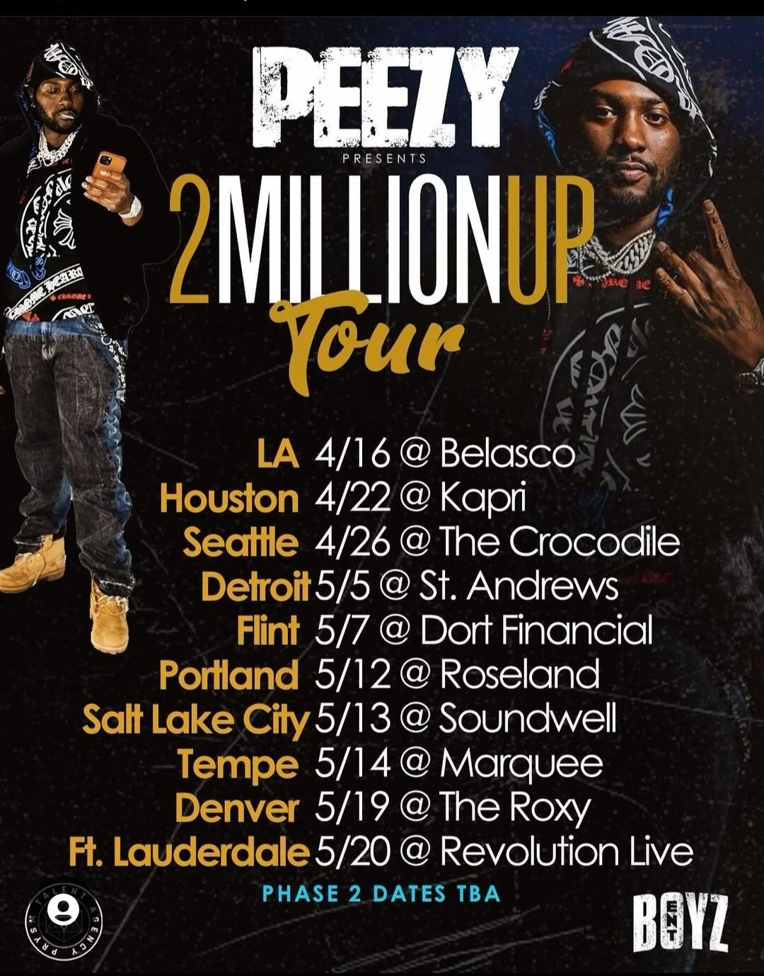 2 Million Up the hit single from Peezy has more legs than a caterpillar, Good music last, and 2 Millon up is making its way across the country. With that said Peezy has officially announced hit 2 Million up tour currently with 10 dates with more to be added coming soon. Make sure you tap in when he comes to a town near you.