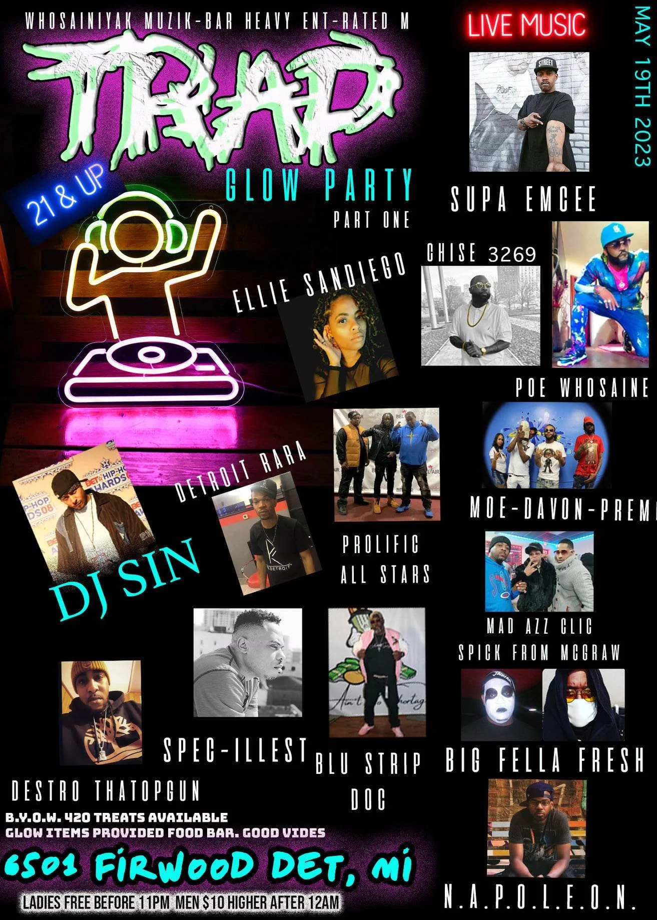 TRAP GLOW PARTY PT 1 MAY 19th May 10 Written By Uncle P WhoSainyac Musik - Bar Heavy Ent - Rated M Presents the Glow Party. LIVE ENTERTAINMENT May 19th. BYOW 420 Treats available, make sure you come out and have a good time with DJ Sin and a few of Detroit’s finest emcees. Uncle P